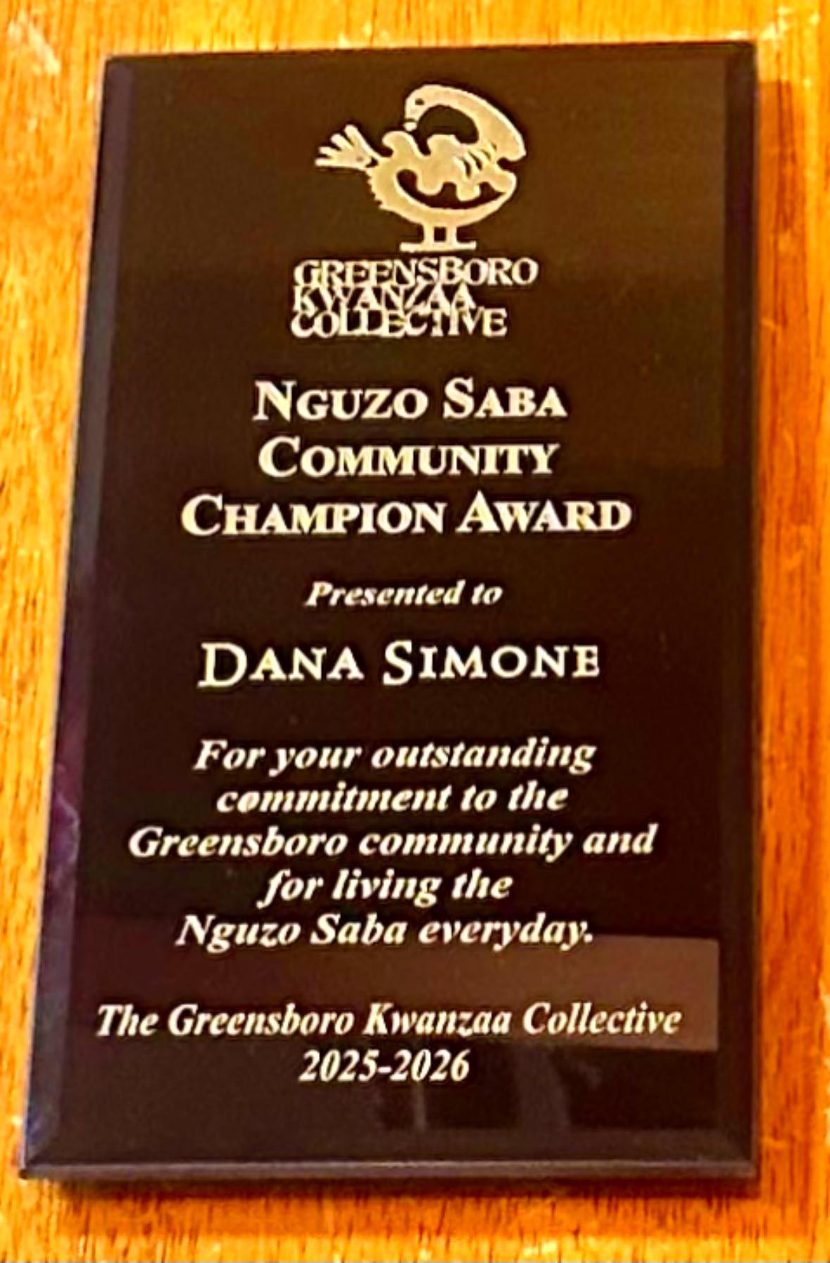 Going into the New Year, Body & Soul / Dana Simone received the Kwanzaa Nia Award from the Greensboro Kwanzaa Collective!